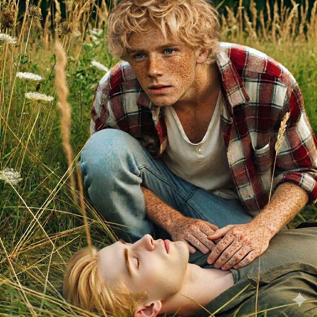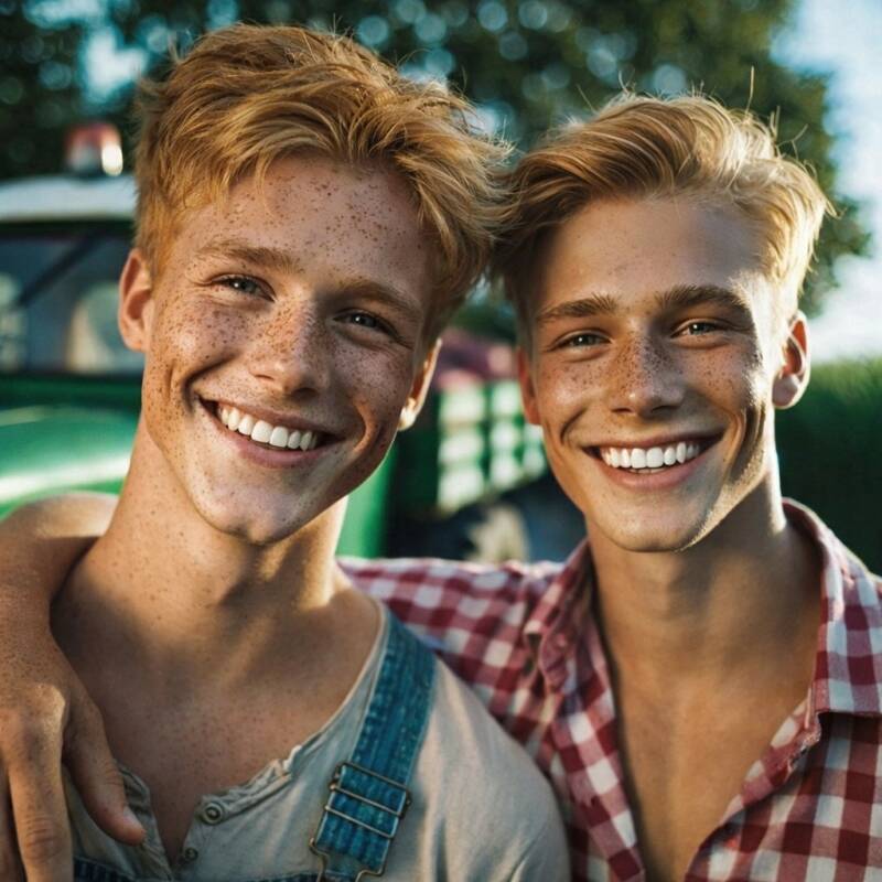 "Who are you?" the stranger whirled around showing a reddened face, a freckled nose, a dimpled chin, blue eyes, and a suspicious look. He looked as though he'd worked on a farm. I'd thought I had been looking in a mirror!